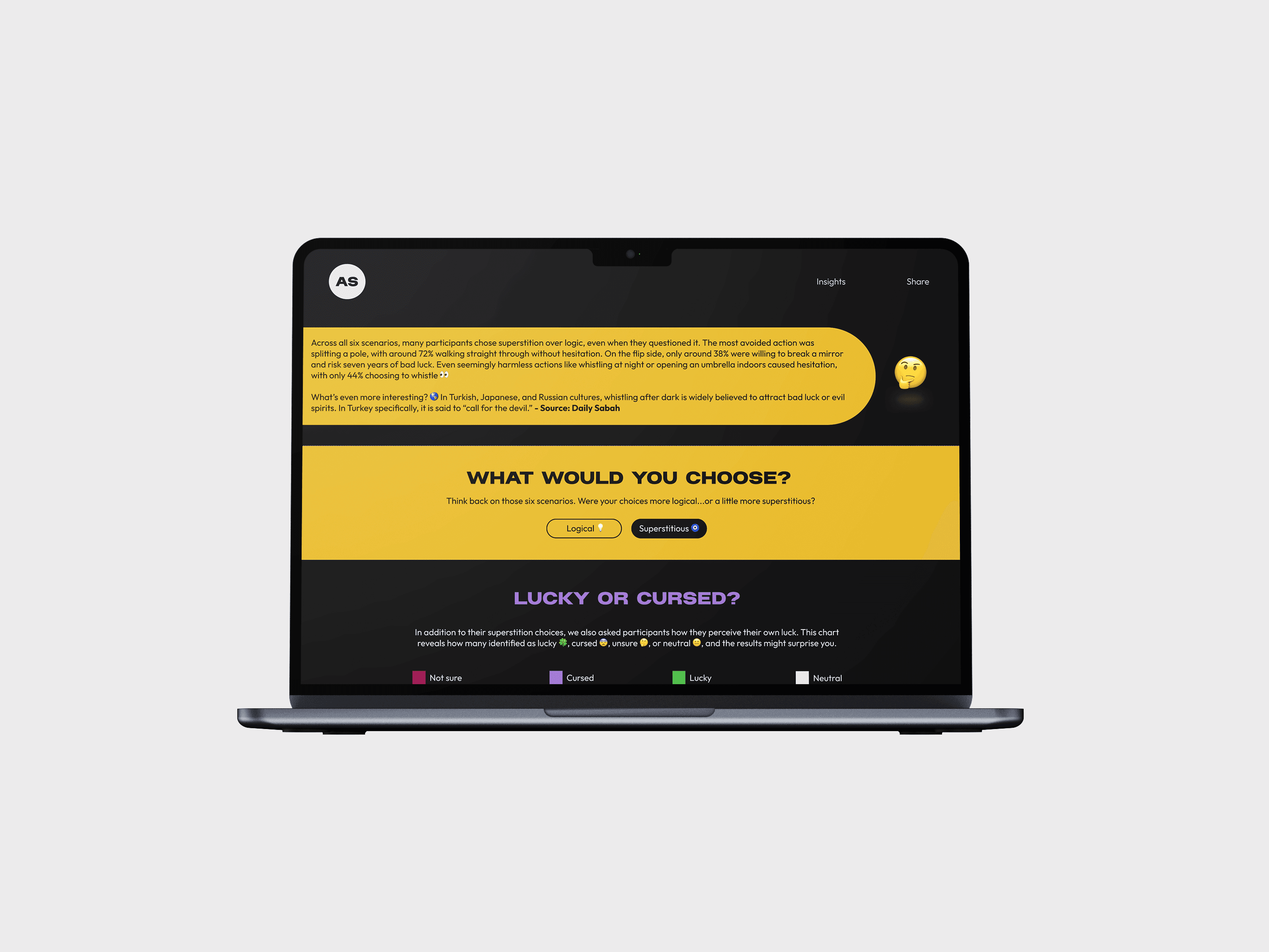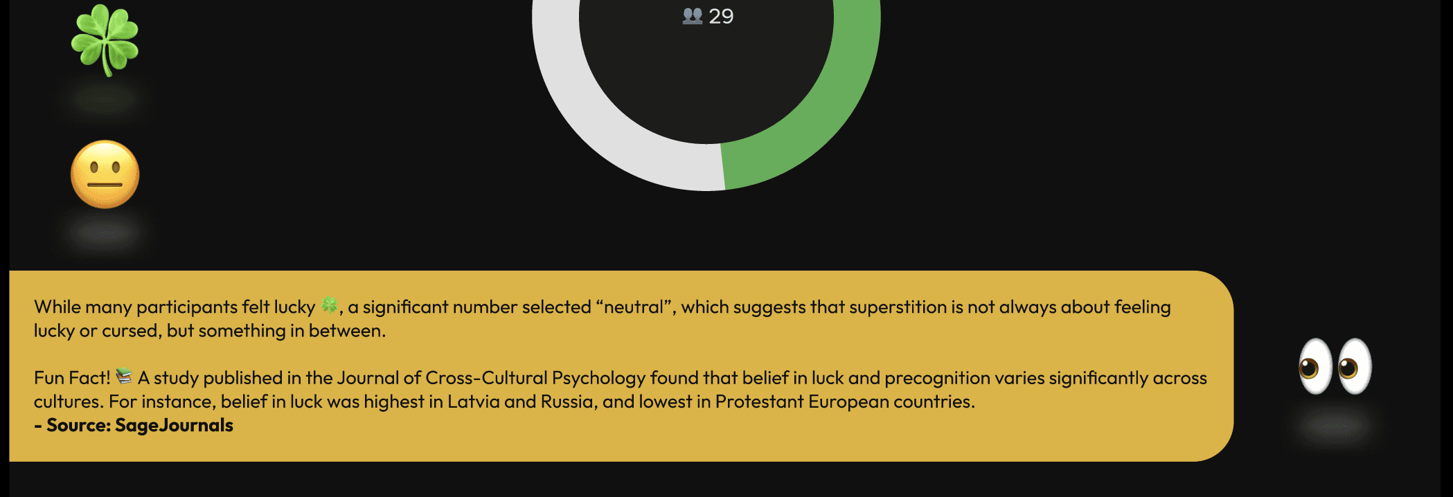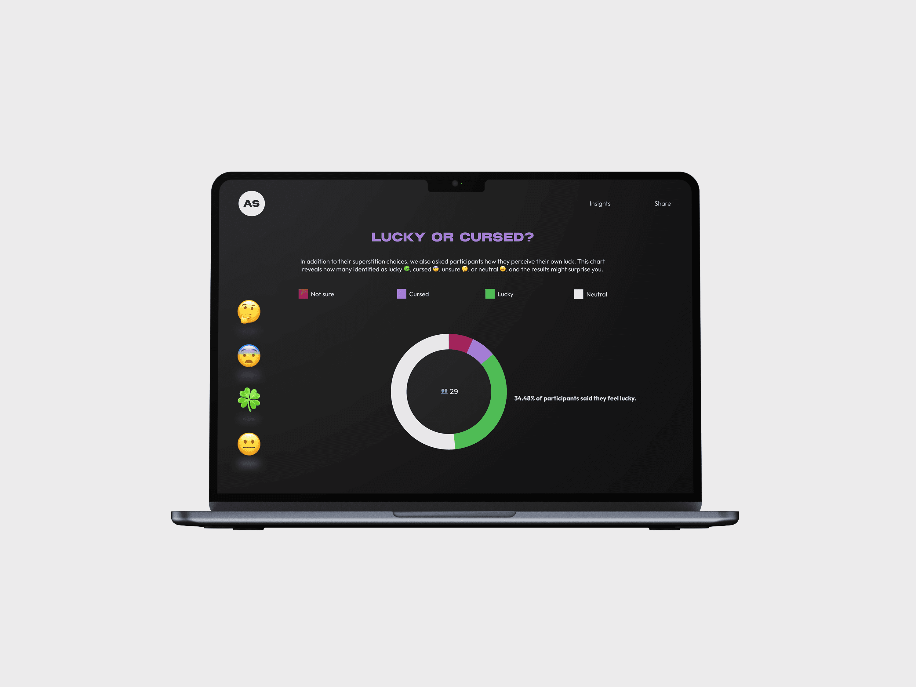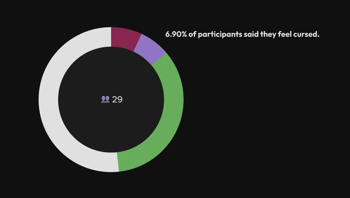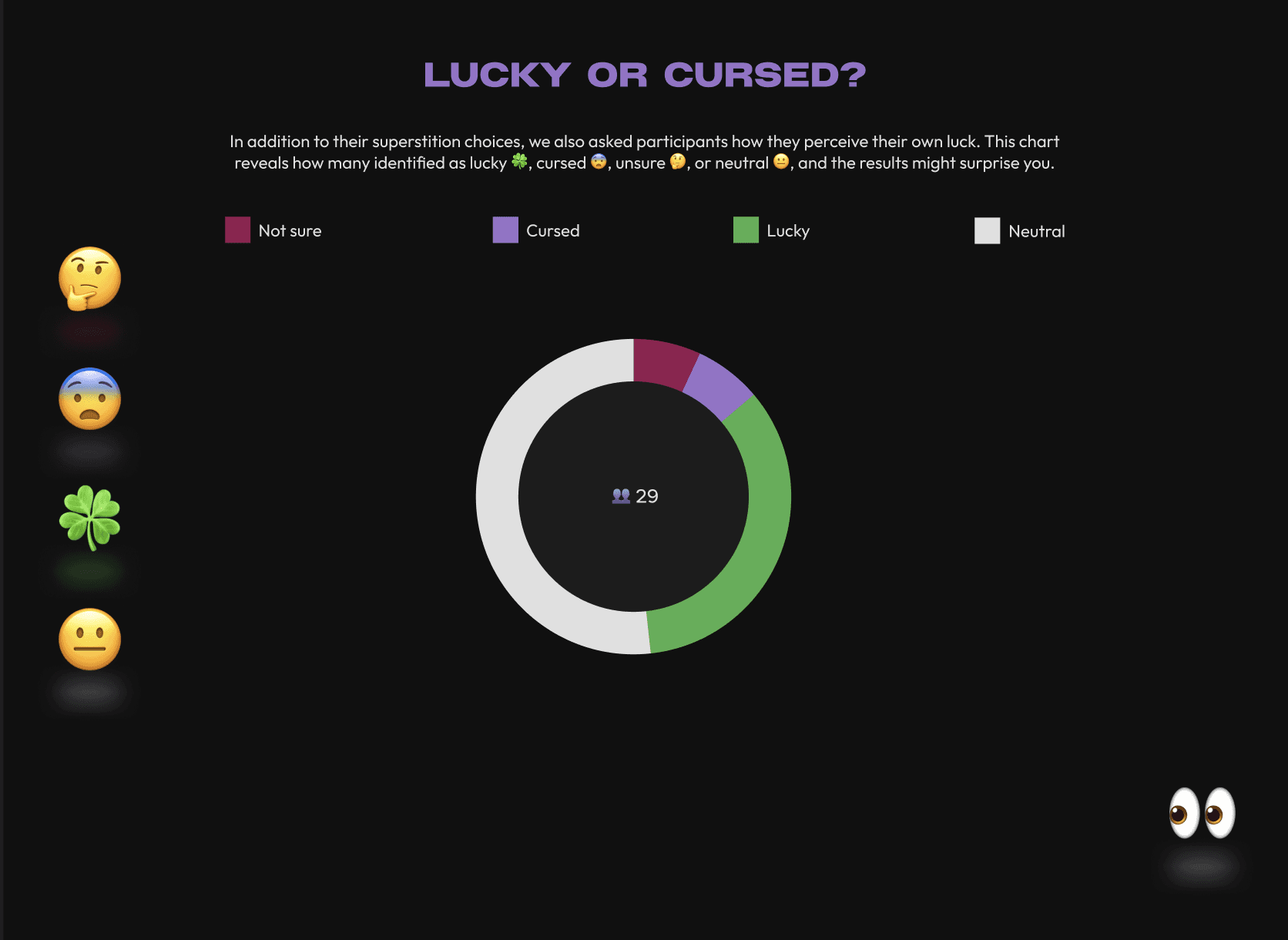 The final chart asked participants whether they see themselves as lucky, cursed, neutral, or unsure, which is a natural closer that encourages users to reflect on their own beliefs.