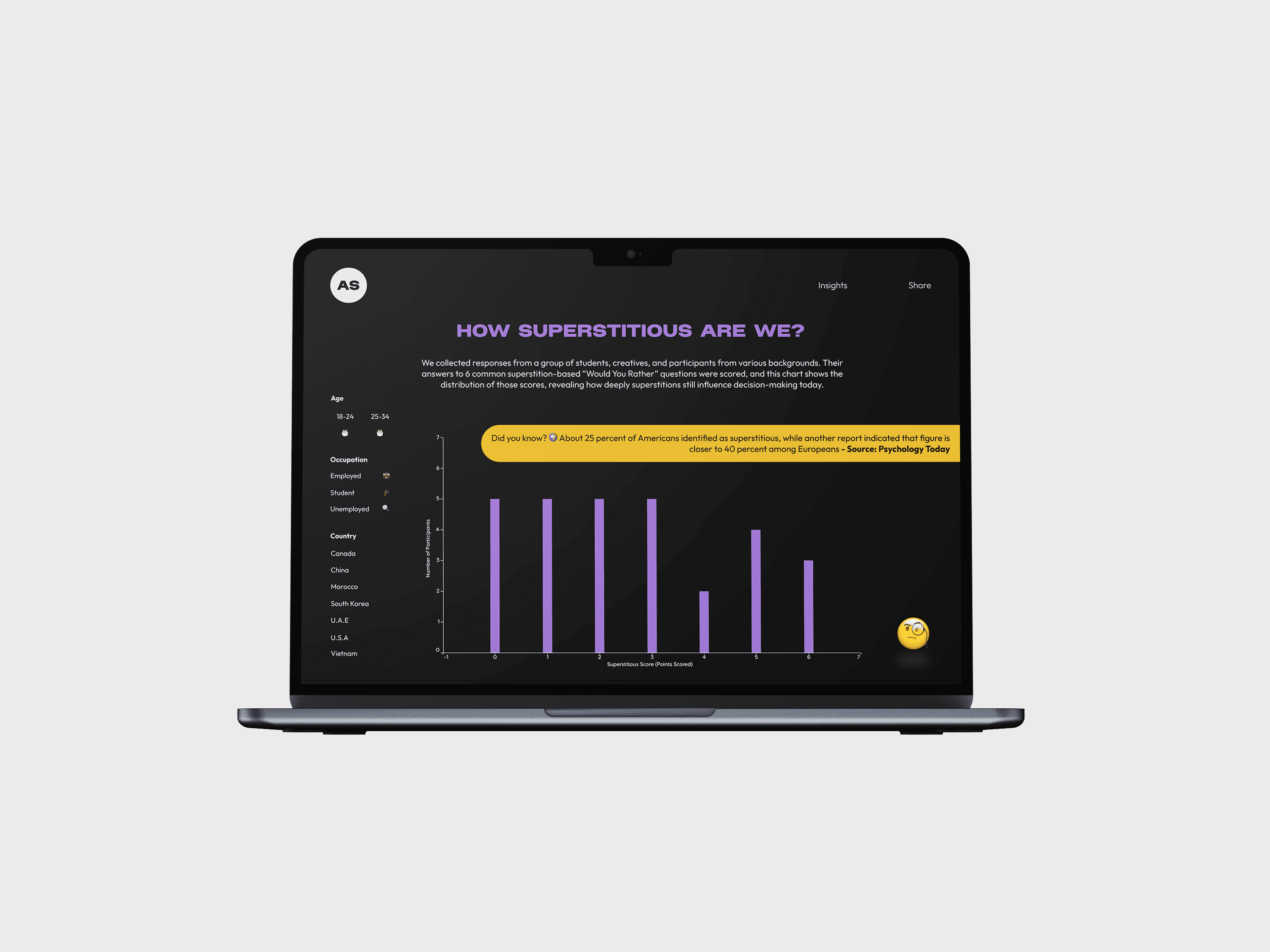 I used emoji as filters to make the interaction feel playful and intuitive. Hovering over each emoji reveals how many participants selected that option, along with additional context and a supporting fact from an external source to close the narrative seamlessly.