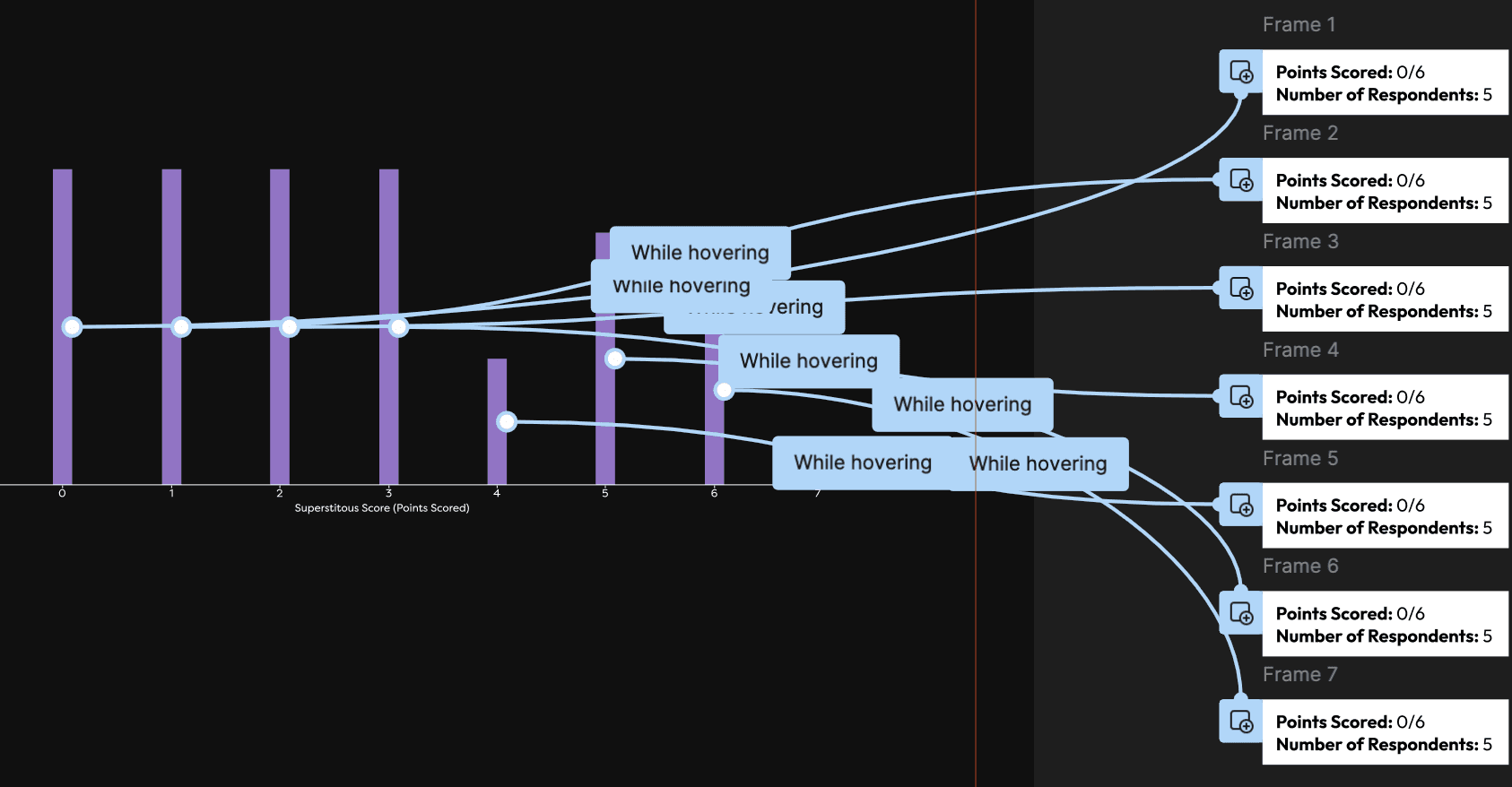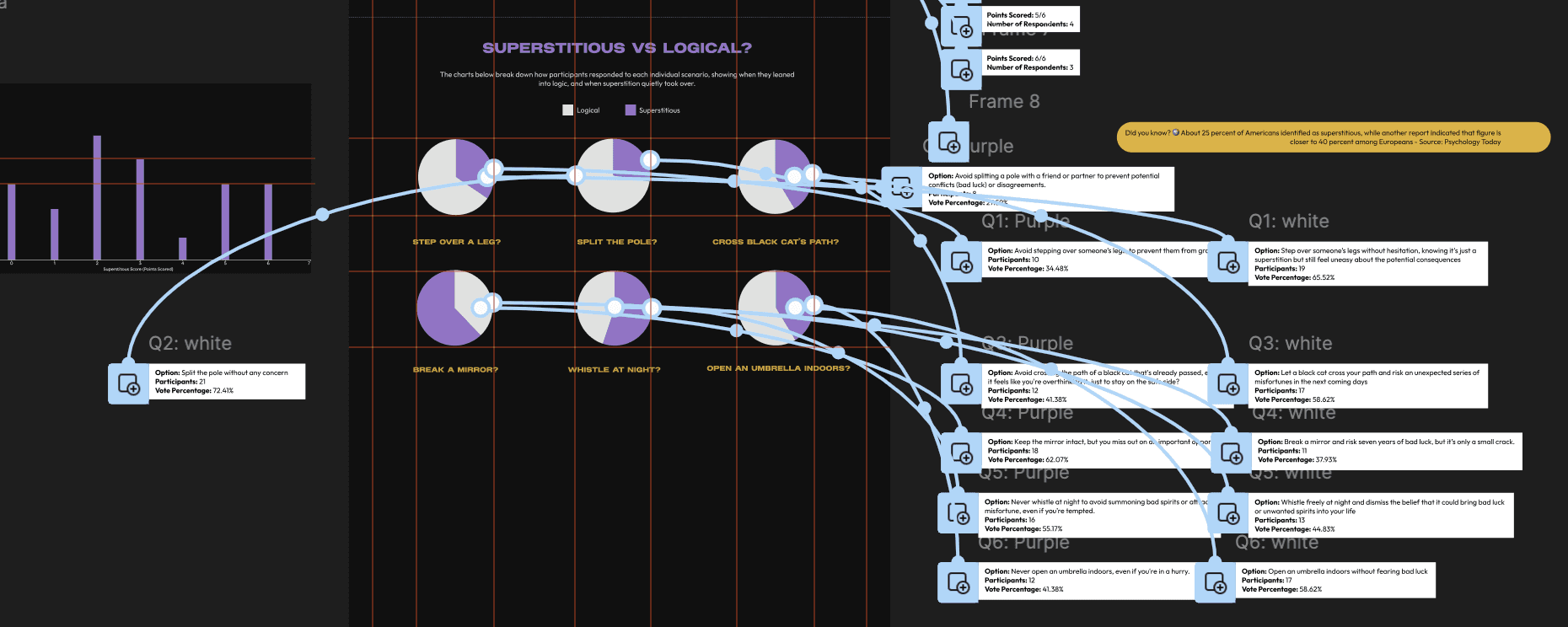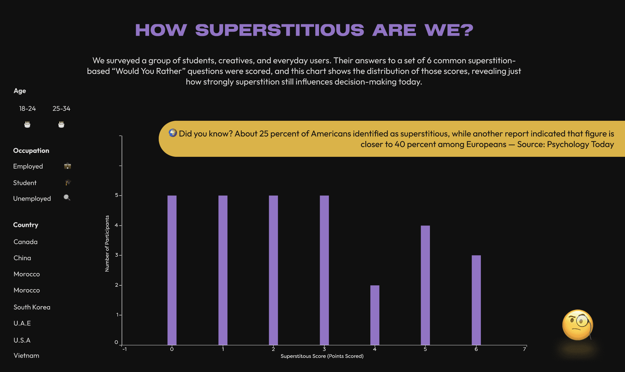 I started with the score distribution chart to give users an immediate overview of participant superstition levels, setting the tone for the experience. A bar chart was chosen as the clearest way to show score distribution across different demographic and surface patterns at a glance.