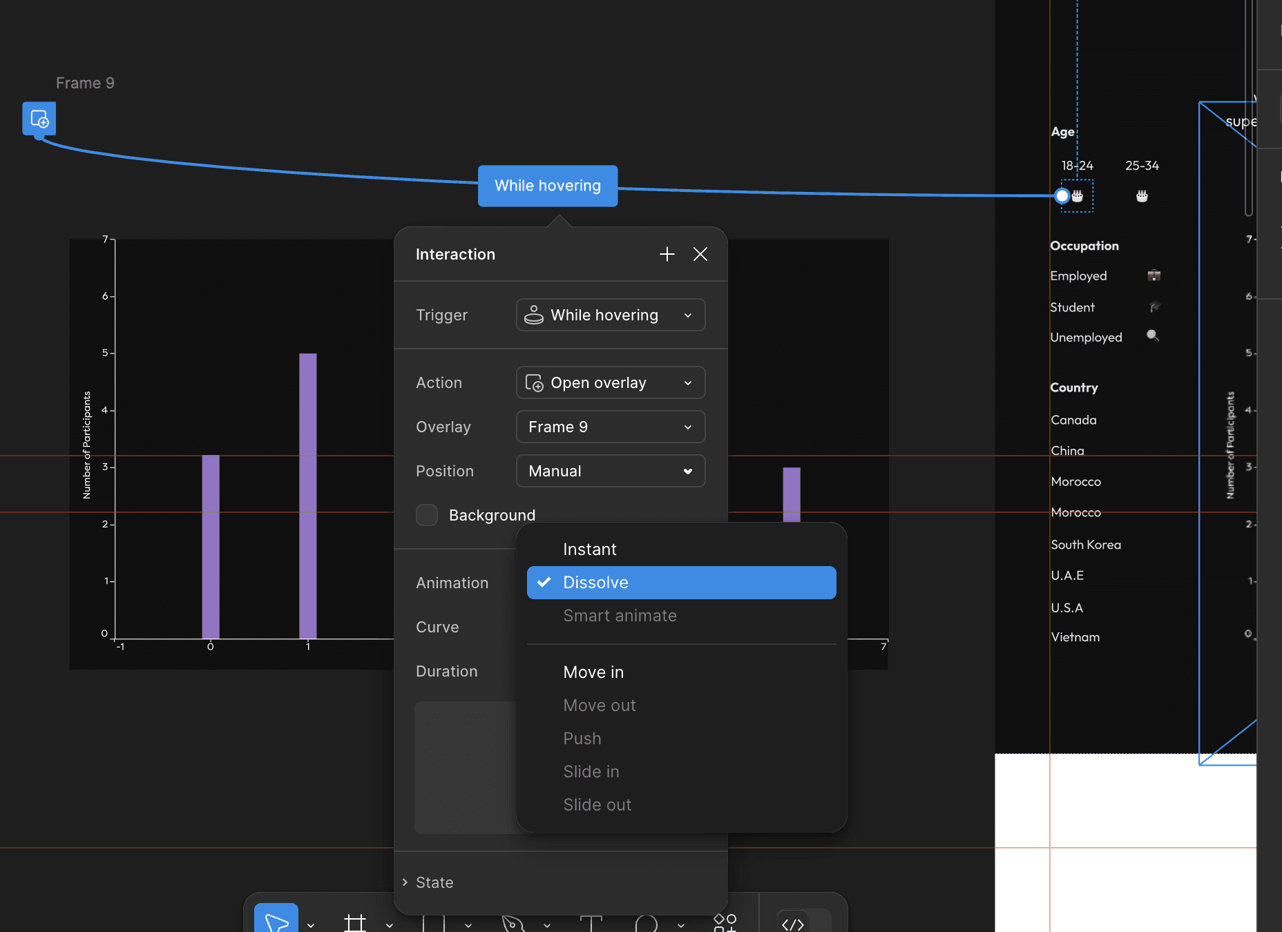 Charts were exported from Tableau as SVGs into Figma, allowing me to edit colours and add interactions, including tooltip hovers, filters, and a supporting fact that appears when hovering over an emoji. Due to Smart Animate not performing as expected, I switched to hover interactions with open overlays to simulate the bars updating in real time.